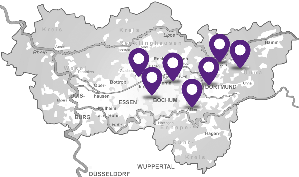 Die Diakonie Ruhr ist im Herzen des Ruhrgebiets aktiv: in Bochum, Witten, Herne, Dortmund, Lünen und Kamen.